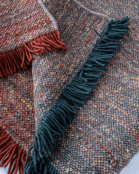 En vez de intentar ordenar las heterogéneas montañas de lanas inclasificlables, hemos optado por aceptar como son y trincharlas. El resultado es una alfombra con un jaspeado vibrante único.