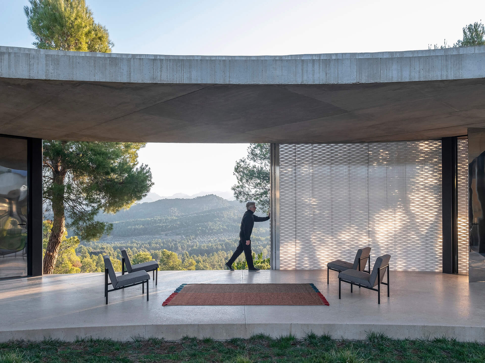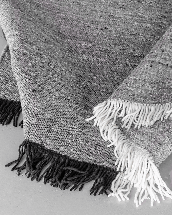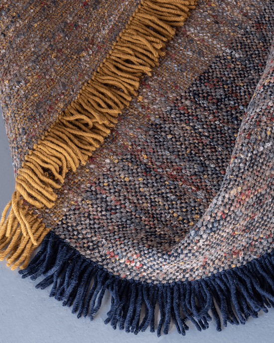 La colección Re-Rug está hecha mediante la técnica hand loomed dhurrie que se caracteriza por ser una alfombra de estructura plana formada a partir del cruce entre la trama y la urdimbre. En el caso de Re-Rug, para obtener una mayor resistencia y calidad, la parte estructural de la alfombra, es decir, la urdimbre, la elaboramos mediante lana virgen de Nueva Zelanda tintada en blanco y negro, amarillo o azul. Y en la trama, el hilo reciclado jaspeado de diferente grosor que varía en color.El resultado es una colección única que se compone de 50% lana virgen y 50% de la lana reusada.
