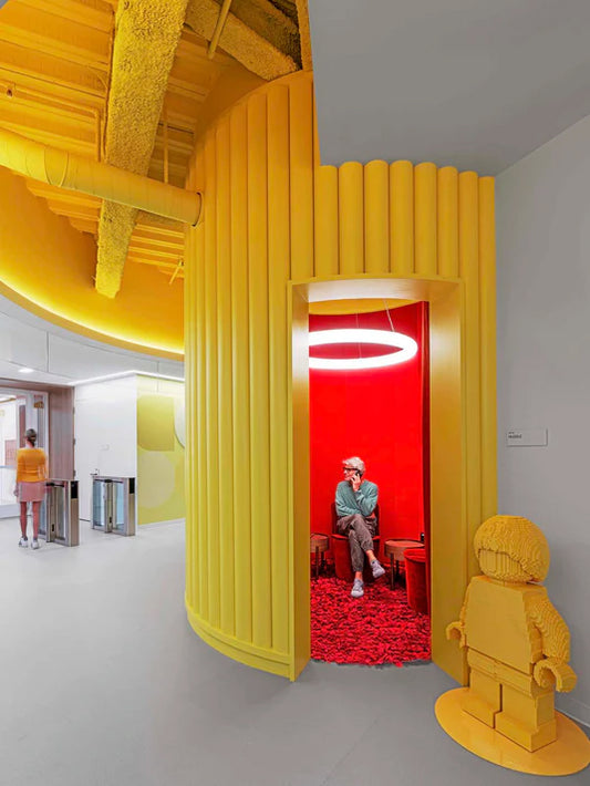 Everything plays here. Color takes on a central role within the interiors: bold yet carefully balanced palettes reference iconic LEGO® bricks while maintaining the sophistication expected of a world-class office headquarters. Texture and materiality introduce warmth, while carefully considered acoustic strategies enhance comfort, reinforcing the idea that productivity thrives in inspiring environments.