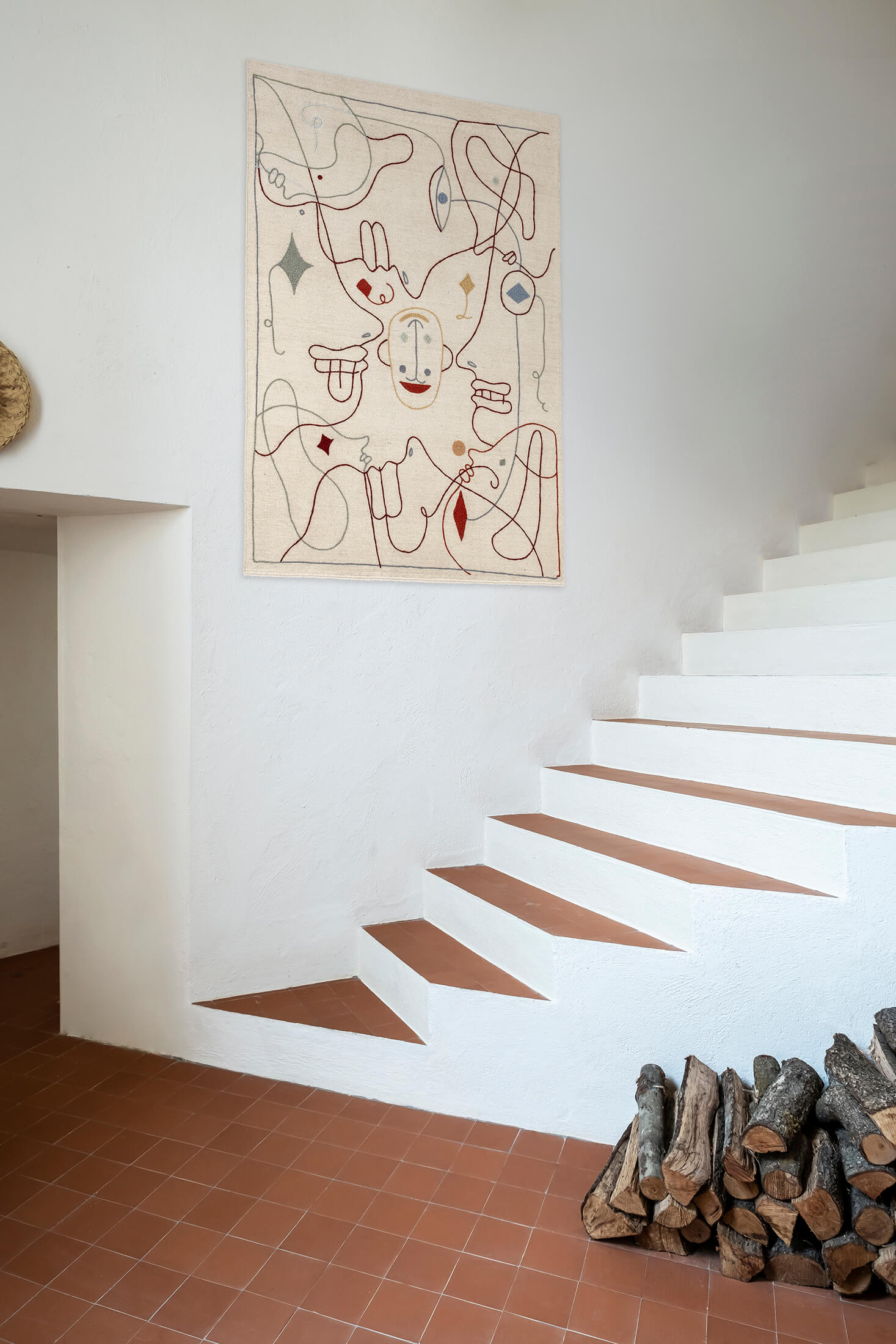 Represented with a delicate line, the illustration defines the silhouettes of various imaginary characters that intertwine and coexist in a beautiful composition. Hayon subtly introduces color through small elements brimming with personality that help interpret each of the images. Nine faces are distributed at different angles so that the rug can be seen from any perspective, fitting perfectly into any space.