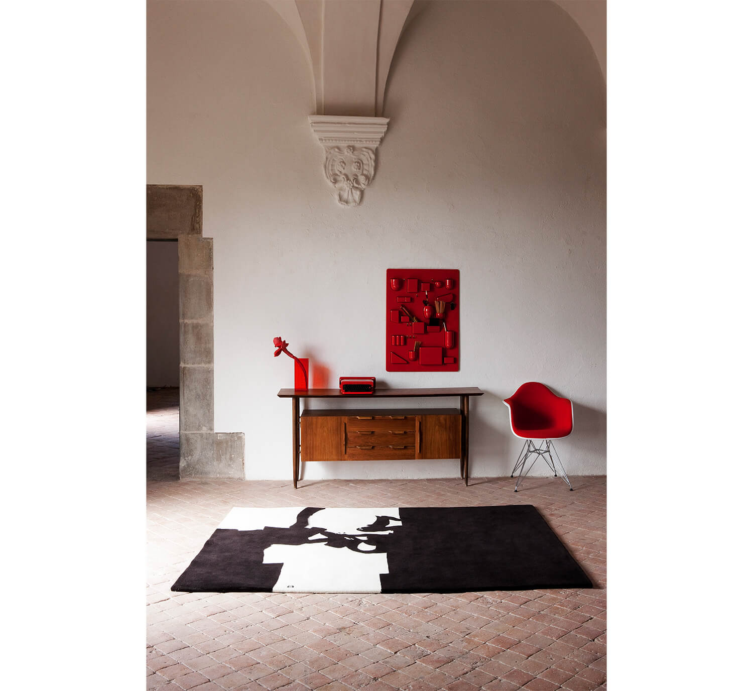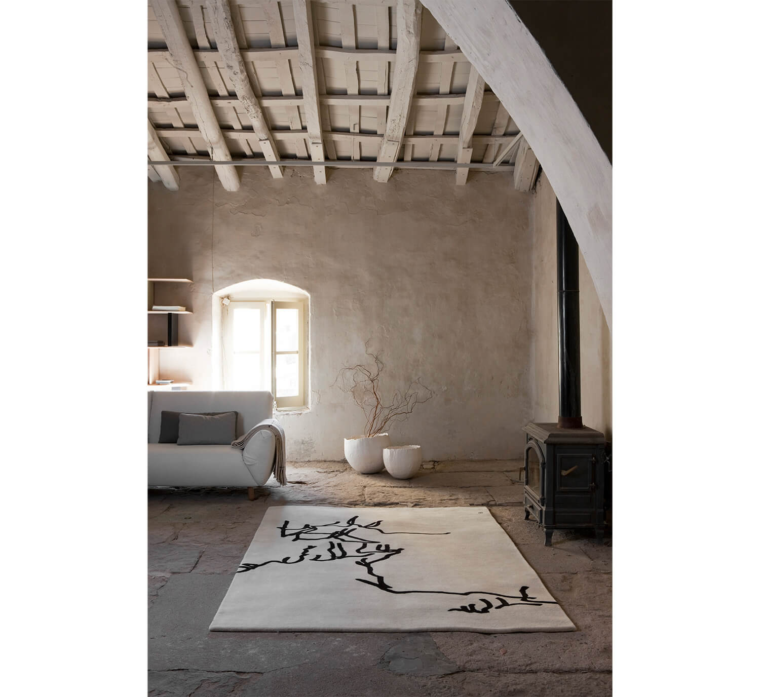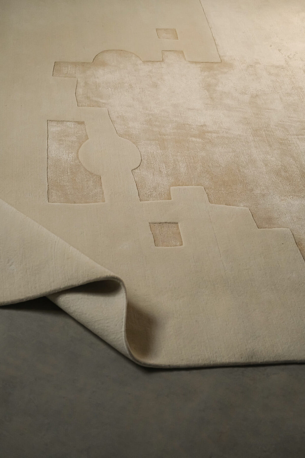 A tribute to the work of the artist Eduardo Chillida, this model is a stunning exercise in reliefs, reminiscent of the artist's signature corten steel sculptures, and specifically his work Gravitación 1994 made with paper. Transposed with the utmost accuracy, Gravitación 1994 is an indoor rug hand-tufted from New Zealand wool.