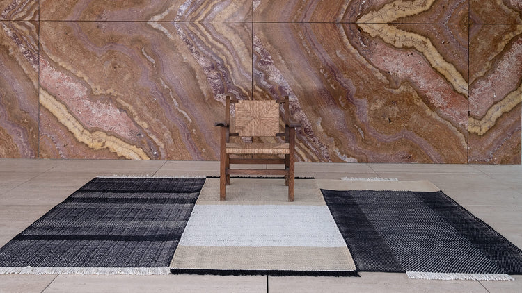 El punto de partida sería el tejido plano. Hasta ese momento, Nani había creado exclusivamente alfombras monocromáticas y lisas. Esta vez, no podía perder de vista su objetivo de lograr un resultado diferente. La clave fue explorar texturas variadas, utilizar hilos de diferentes fibras y grosores, y jugar con la densidad. Pero, ¿cómo integrar todo esto en solo 4m²?