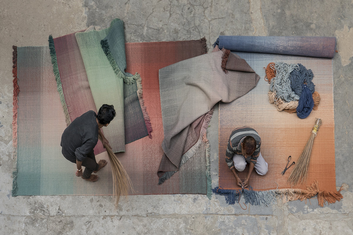 Es imposible definir un único color en la alfombra Shade, por eso hablamos de paletas de color. Cada alfombra de la colección cuenta con una paleta formada por 6 colores que forman un degradado. En el telar, este degradado se dispone tanto en vertical como en horizontal, confluyendo en un mismo plano a medida que se teje la alfombra. Pero ¿cómo se consigue que los colores fluyan de uno a otro de manera orgánica? Combinando secuencias de colores solidos con transiciones de color y siguiendo estrictamente las distintas fases de cada transición de color.