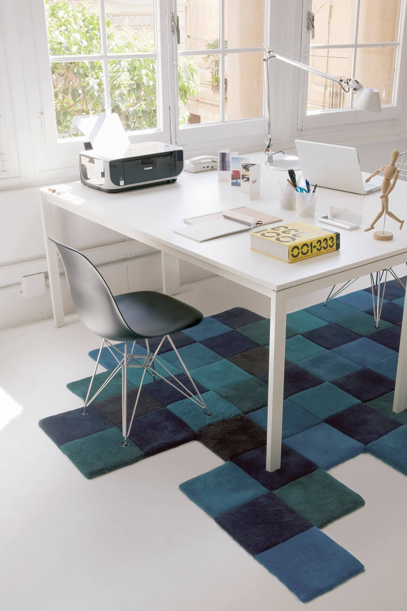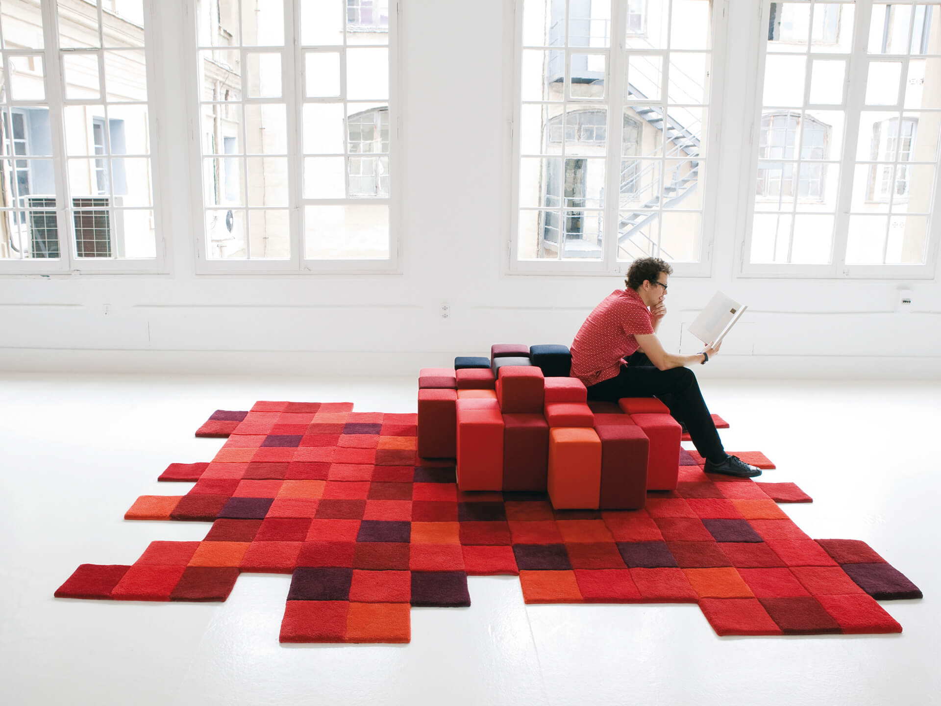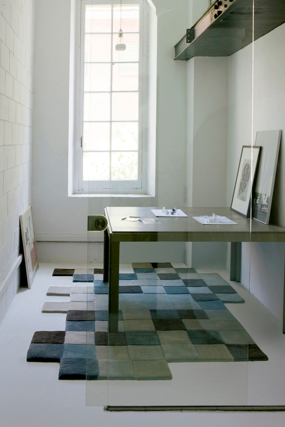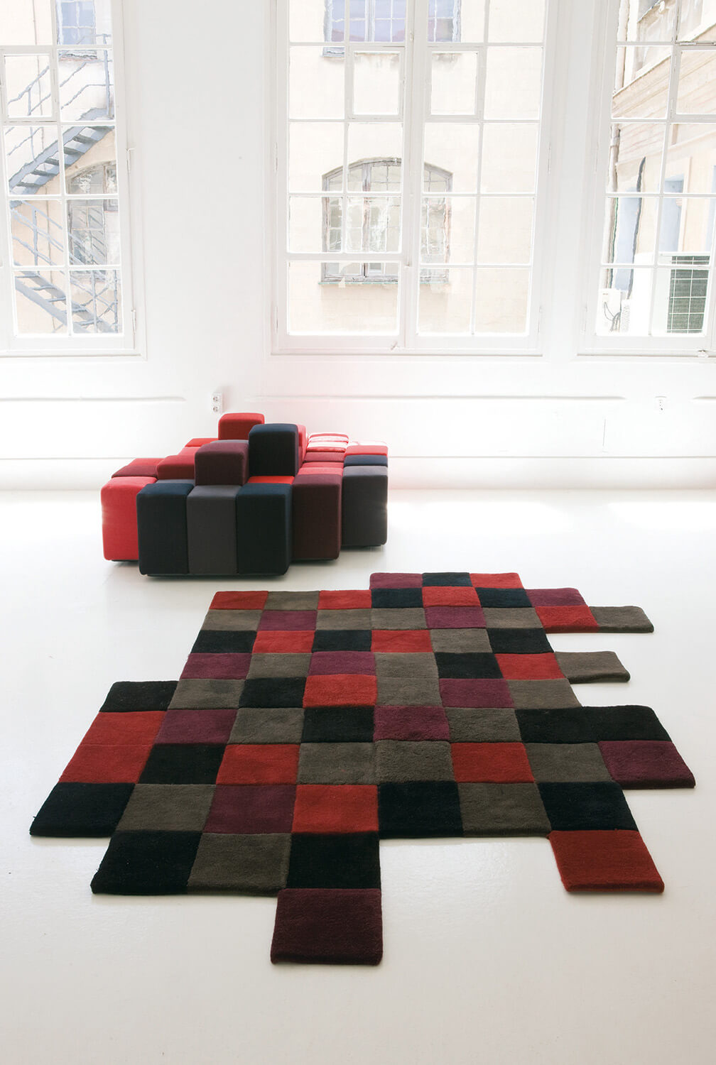 Por otro lado, su extraordinario formato comporta múltiples vértices que parecen finales de un puzzle inacabado. Este juego de volúmenes y niveles permite alfombras a medida, customizadas.