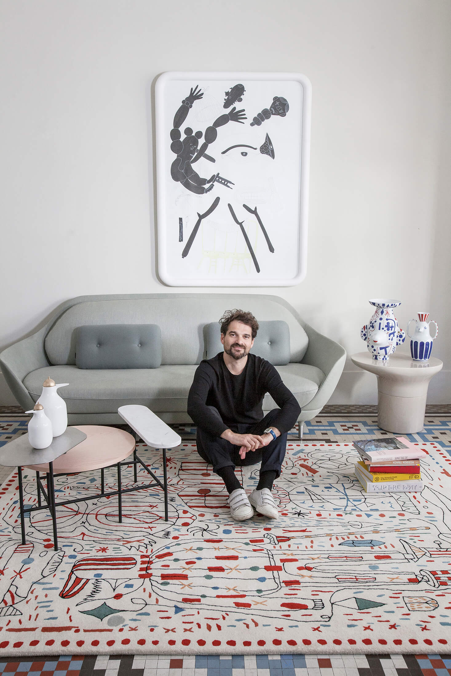 A primera vista, una maraña caótica de colores y formas invade la alfombra. Sin embargo, al observar atentamente descubriremos el imaginario de Jaime Hayon: tortugas, labios manos, taburetes, peces, hombre-pájaro…