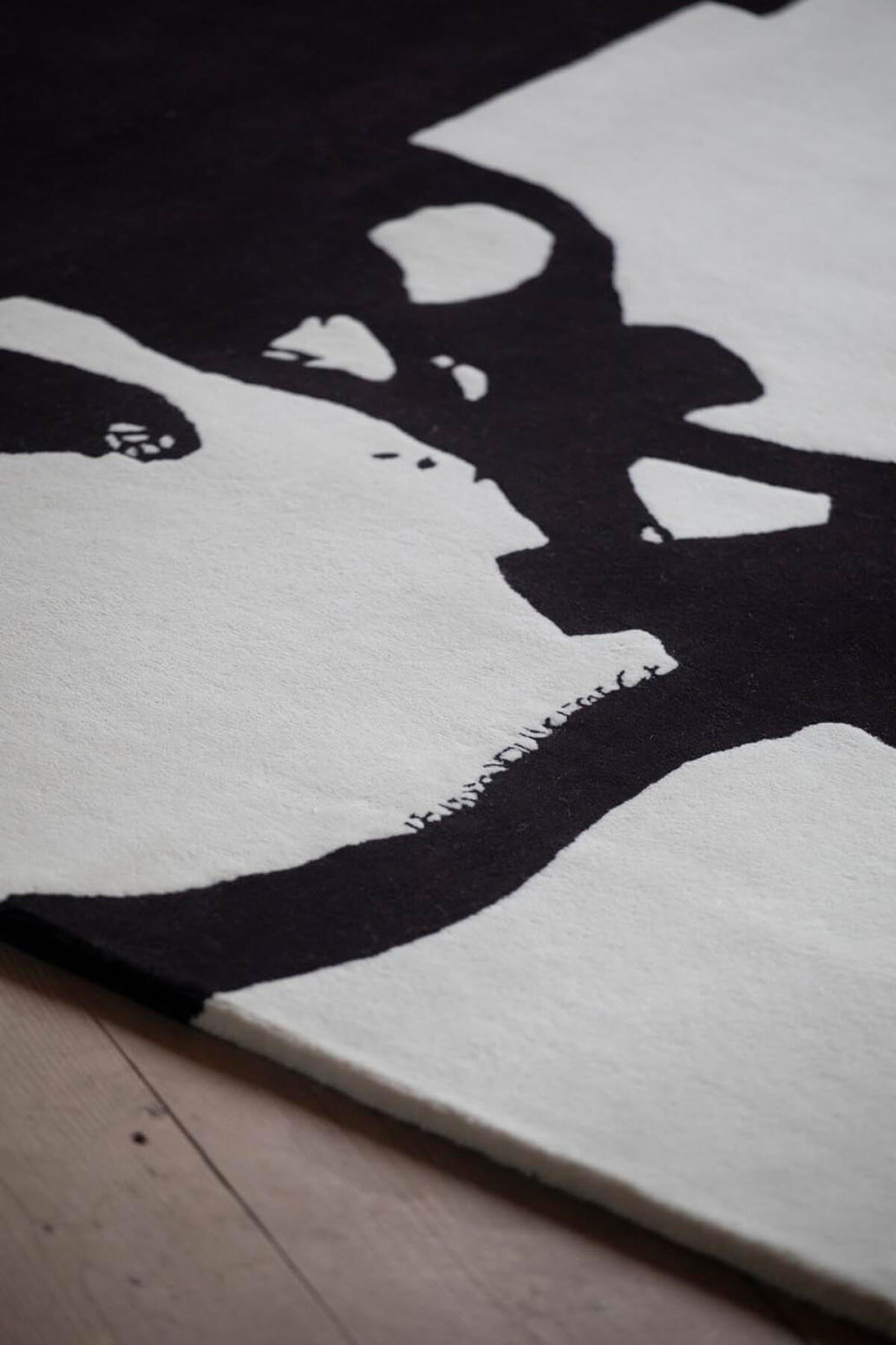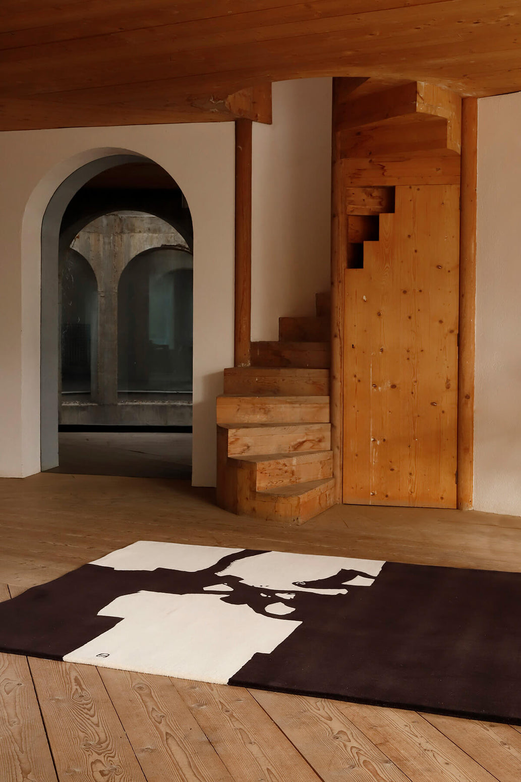 Transformada en alfombra, Chillida Collage 1966 es una pieza de gran fuerza pictórica y visual tejida a mano con lana de Nueva Zelanda mediante la técnica de hand tufted.