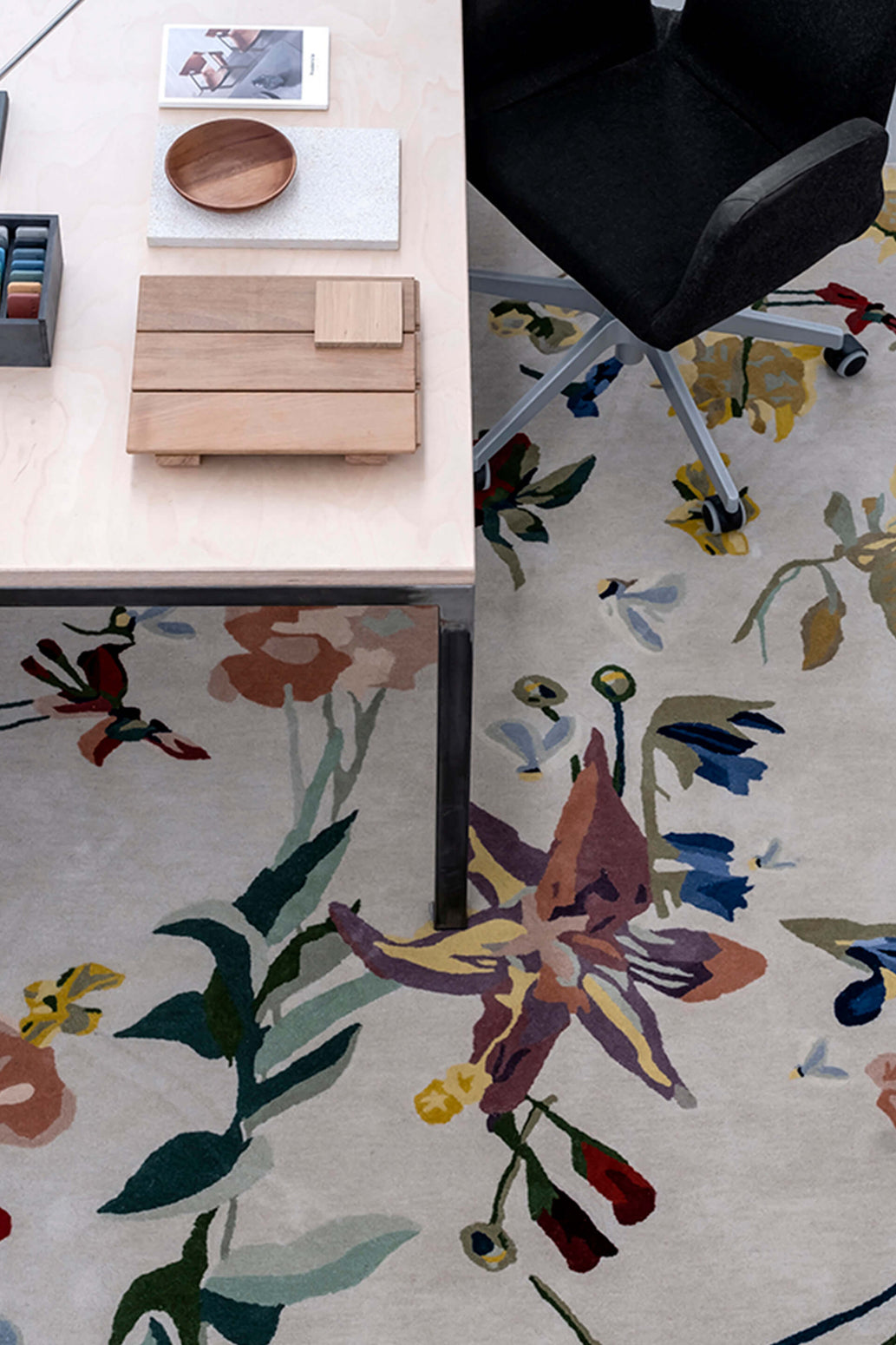 Basada en la obra del artista Santi Moix, Promenade reinterpreta las flores del artista en una composición equilibrada donde destacan las flores en todas sus fases, desde la explosión a la fragilidad. Una alfombra llena de color y energía que muestra la belleza de lo natural, la imperfección y la aceptación del ciclo de vida y la muerte.
